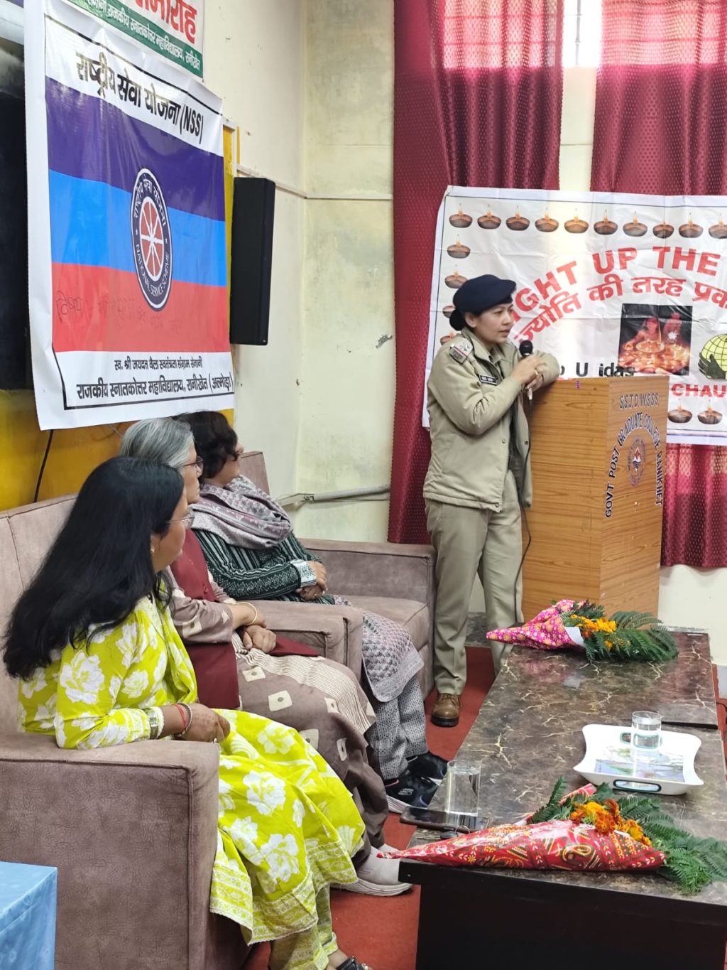 कार्यक्रम एस आई कोतवाली रानीखेत हेमा कार्की एवं सुचेतना संस्था की दीपा आर्य के नेतृत्व में और महाविद्यालय प्राचार्य डॉ प्राची जोशी के निर्देशन में संपादित हुआ। व्याख्याता के तौर पर एस . आई. हेमा कार्की अपने वक्तव्य में महाविद्यालय की छात्र-छात्राओं एवं शिक्षकों को महिला सशक्तिकरण महिला सुरक्षा और साइबर अपराध से संबंधित विस्तृत जानकारी प्रदान की । एस . आई. ने छात्र-छात्राओं को नारी सुरक्षा के लिए संचालित विभिन्न योजनाओं की जानकारी दी। उन्होंने स्वयंसेवियों को संबोधित करते हुए कहा कि उन्हें शारीरिक और मानसिक रूप से स्वस्थ रहना चाहिए और सुरक्षित महसूस करना चाहिए ।साथ ही किसी भी मुसीबत या असुरक्षा की स्थिति में हौसले और बुद्धिमत्ता से कार्य करना चाहिए। उन्होंने अपने व्याख्यान में महिला सुरक्षा के लिए जारी किए गए हेल्पलाइन नंबर्स की जानकारी भी प्रदान की। जिनका उपयोग कर महिलाएं और छात्राएं असुरक्षा की स्थिति से उबर सकती है। ये हेल्पलाइन नंबर इस प्रकार है–1930, 112,1090