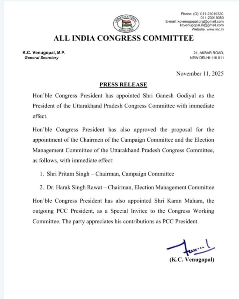 कांग्रेस अध्यक्ष ने उत्तराखंड प्रदेश कांग्रेस कमेटी की प्रचार समिति और चुनाव प्रबंधन समिति के अध्यक्षों की नियुक्ति को भी हरी झंडी दे दी है। महासचिव के सी वेणुगोपाल ने नियुक्ति आदेश जारी किए।