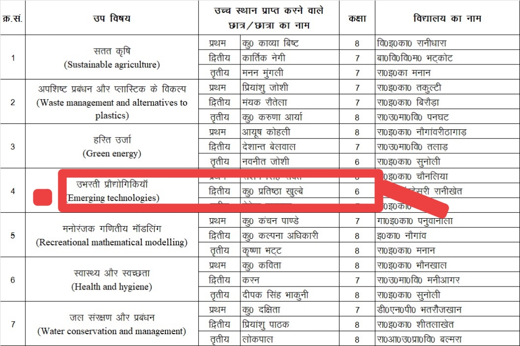 यह प्रतियोगिता 19से 21 नवंबर तक खालसा नेशनल बालिका इंटर कॉलेज हल्द्वानी में आयोजित होगी। प्रतिष्ठा ने जनपद स्तरीय प्रतियोगिता में ‘उभरती प्रोद्योगिकियां’ विषयक स्पर्धा में प्रतिभाग करते हुए द्वितीय स्थान हासिल कर राज्य स्तरीय विज्ञान प्रतियोगिता के लिए अपना स्थान सुरक्षित किया। प्रतिष्ठा की इस सफलता पर विद्यालय के प्रधानाचार्य व शिक्षक -शिक्षिकाओं ने उसे बधाई देते हुए आगामी राज्य स्तरीय प्रतियोगिता में सफल होने की कामना की है।