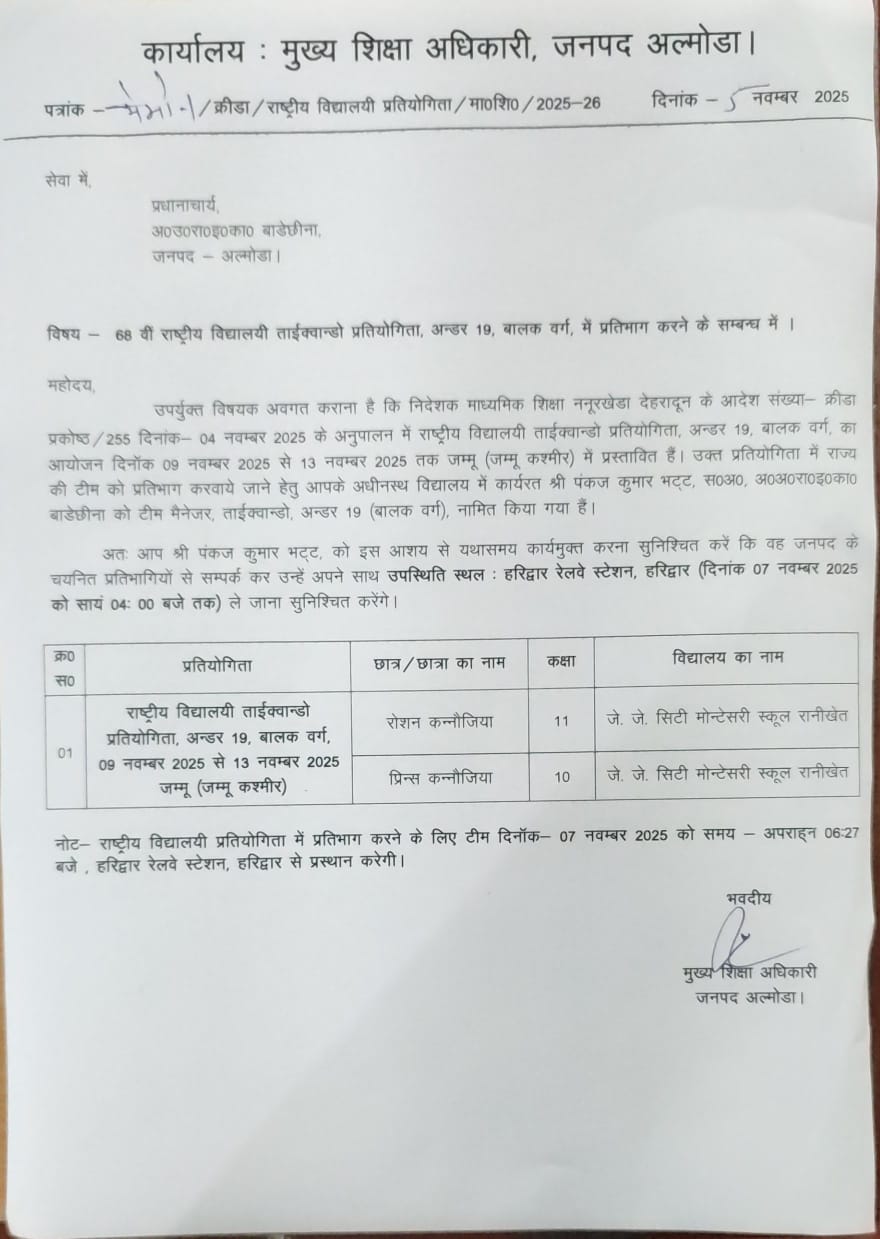 9नवंबर से 13नवंबर तक जम्मू (जम्मू कश्मीर) में आयोजित होने जा रही राष्ट्रीय विद्यालयीन ताइक्वांडो प्रतियोगिता अंडर 19 बालक वर्ग में सिटी मांटेसरी स्कूल गनियाद्योली रानीखेत के दो छात्र क्रमशः रौशन कन्नोजिया कक्षा 11व प्रिंस कन्नोजिया कक्षा 10 प्रतिभाग करेंगे। जनपद के चयनित खिलाड़ियों की टीम का मैनेजर पंकज कुमार भट्ट सहायक अध्यापक अटल आदर्श राजकीय इंटर कॉलेज बाड़ेछीना को बनाया गया है। जिनके मार्गदर्शन में ताइक्वांडो टीम राष्ट्रीय प्रतियोगिता में प्रतिभाग करेगी ।इस आशय की जानकारी मुख्य शिक्षा अधिकारी अल्मोड़ा के जारी पत्र में दी गई है।
