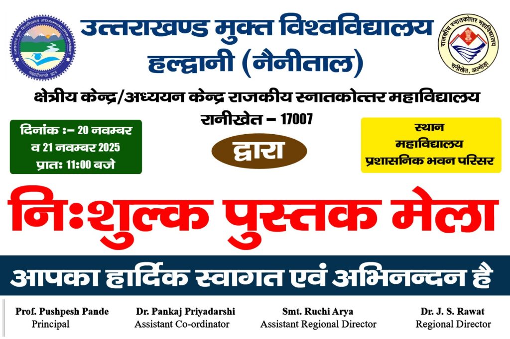 उत्तराखण्ड मुक्त विश्वविद्यालय हल्द्वानी का क्षेत्रीय केन्द्र रानीखेत व अध्ययन केन्द्र राजकीय स्नातकोत्तर महाविद्यालय रानीखेत 20व 21नवंबर को करेगा पुस्तक मेला आयोजित