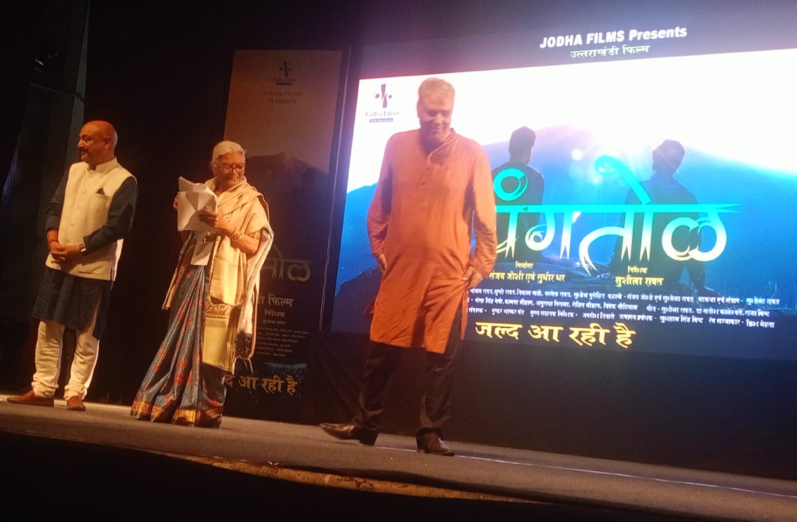 आंचलिक फिल्म ‘घंगतोल’ के टीजर व गीतों को भव्य अंदाज में रिलीज करने के उपरांत जोधा फिल्म निर्माताओं द्वारा मंचासीन सभी मुख्य, विशिष्ट व अन्य अतिथियों तथा फिल्म निर्देशिका सुशीला रावत का तालियों की गड़गड़ाहट के मध्य शाल ओढ़ा कर, आंचलिक टोपी पहनाकर तथा पुष्प गुच्छ भेंट कर सम्मानित किया गया।