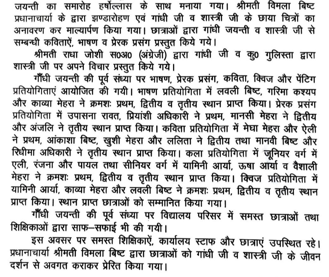 राजकीय बालिका इंटर कॉलेज रानीखेत में महात्मा गांधी एवं पूर्व प्रधानमंत्री लाल बहादुर शास्त्री की जयंती हर्षोल्लास से मनाई गई