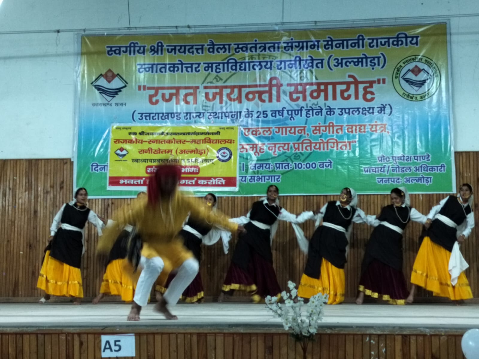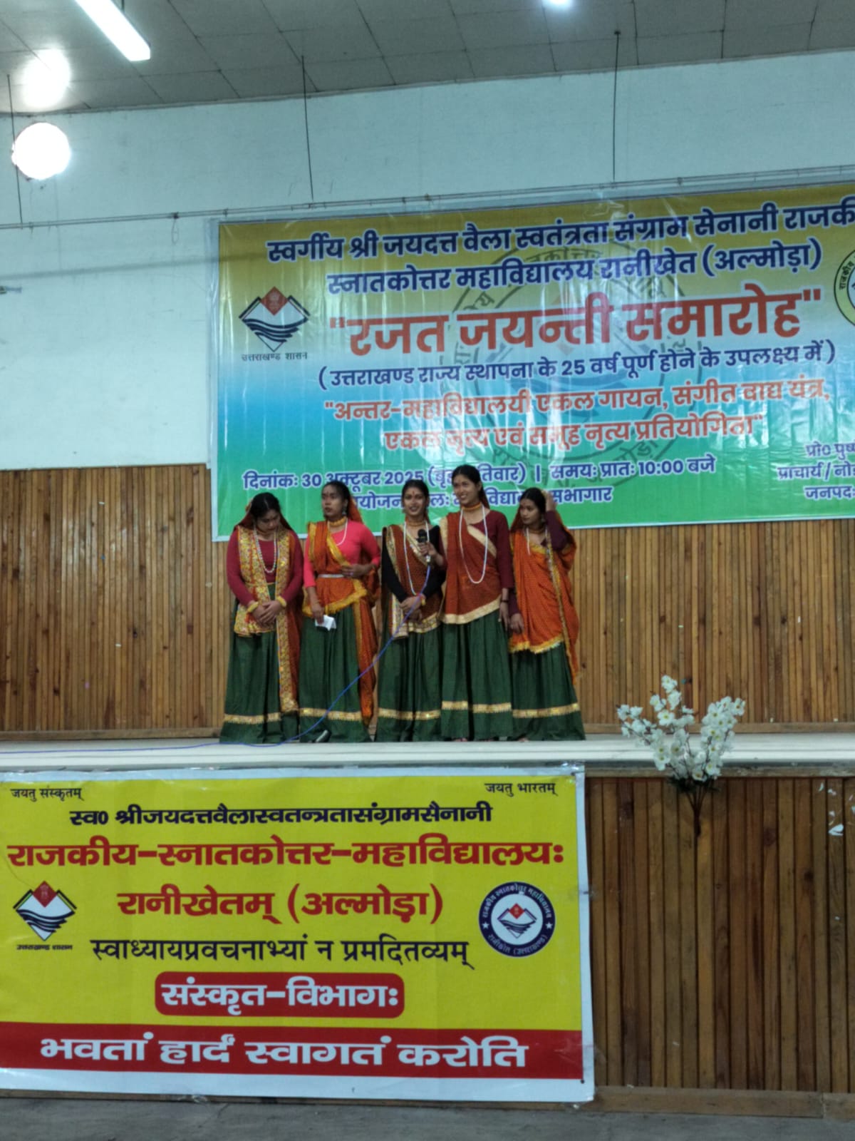 उत्तराखंड राज्य स्थापना की रजत जयंती के उपलक्ष्य में शासन के निर्देशों के अनुपालन में आज स्व. जय दत्त वैला स्व. स. से. राजकीय स्नातकोत्तर महाविद्यालय, रानीखेत में प्रातः 10:30 बजे से सांस्कृतिक कार्यक्रम का भव्य आयोजन किया गया।